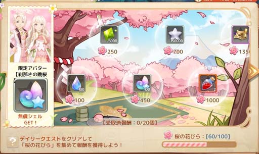 イベント期間中、「桜の花びら」を集めるとイベント限定のアバター「刹那さの晩桜」などの進捗報酬を獲得できます!