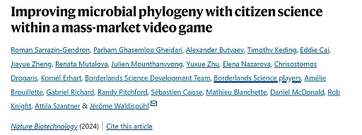 自分で載せておきながら我々も存在をすっかり忘れてしまっていたが,あれから4年が経ち,ようやくその成果が世に出てきた。科学誌「Nature Biotechnology」に2024年4月15日付で,「Improving microbial phylogeny with citizen science within a mass-market video game」(市民科学※を市販ゲームに組み込み,微生物の系統発生を改善する)という題の論文が掲載された。そこには,「Borderlands Science players」という名が,共著者として連ねられているのだ。