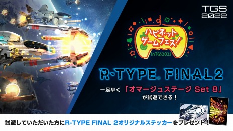期間中、追加DLCオマージュステージ第8弾「R-TYPE FINAL 2-オマージュステージ Set8」を一足早く試遊体験することができます。また、試遊体験してくださった方に、「R-TYPE FINAL 2オリジナルステッカー2枚セット」をプレゼントします!ぜひ、ハピネットブースにお越しください!よろしくお願いいたします。