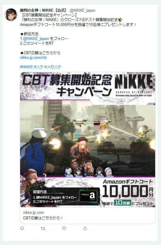 CBTは3月中に開催する予定です。詳細は公式Twitter(@NIKKE_japan )をフォローして、最新情報をご確認ください。