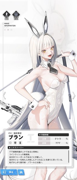 ブランはテトラが開発したニケで,新登場の部隊“777”に所属している。コードは“風圧”,武器は“アサルトライフル”,バーストの属性は“II”の防御型となる。