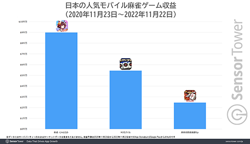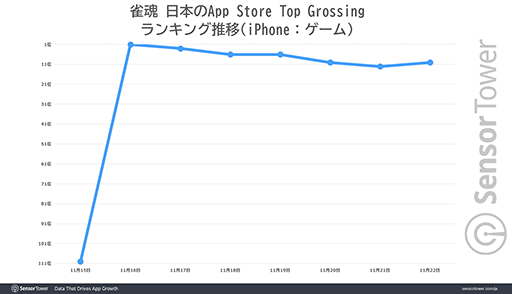 雀魂は,2019年4月にPCブラウザ版のサービスを開始し,同年11月にはスマホアプリ版(iOS / Android)もリリースされているタイトルだ。Sensor Towerのストアインテリジェンスのデータによると,リリースから2022年11月20日までの日本における累計収益は1億ドルを突破しているという。