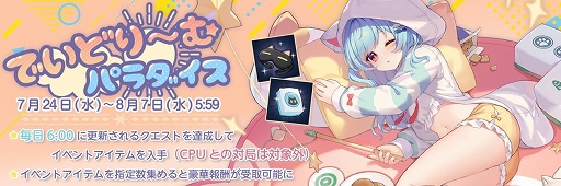 株式会社 Yostar は、当社が運営している対戦型麻雀ゲーム『雀魂(じゃんたま)』において、7 月 24 日(水)メンテナンス後で期間限定イベント「でいどり〜む・パラダイス」の開催をお知らせします。また祈願『満開の道』や『深緑の道』では、小鳥遊 雛田たちをピックアップいたします。