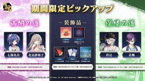 7 月 24 日(水)メンテナンス後より、特定雀士・特定装飾品ピックアップを開催中です。祈願『満開の道』では、「小鳥遊 雛田(CV:村川 梨衣)」、「五十嵐 陽菜(CV:村川 梨衣)」、「撫子(CV:斎藤 千和)」、「ゆず(CV:長縄 まりあ)」、「七海 礼奈(CV:堀江 由衣)」、「北見 紗和子(CV:洲崎 綾)」をピックアップいたします。