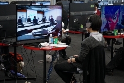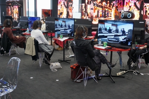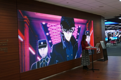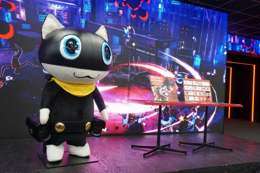 会場となったフロアはP5仕様となっており,入口や中央の大型ディスプレイではゲームのさまざまなシーンが流れ,限定版や店舗別特典の一部が展示されていた。さらに中央のディスプレイ前では,モルガナが試遊の様子を眺めるかのように待機(?)しており,試遊とともに展示やモルガナとの撮影を楽しむ参加者たちも多かったようだ。