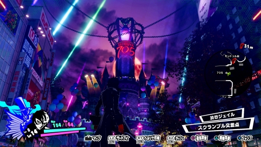 続いてゲームの進め方について。「P5」の舞台にもなっていた渋谷のほか,仙台,札幌,大阪,沖縄など,さまざまな土地を旅して回るというのは既報のとおり。今回プレイした渋谷では,街中を周って異世界に関連する情報を集め,情報量が100%になったらイベントが発生し,異世界に挑むことができるようになる。「P5」のパレスや,メメントスのターゲット探しに近い感覚でゲームが進められそうだ。