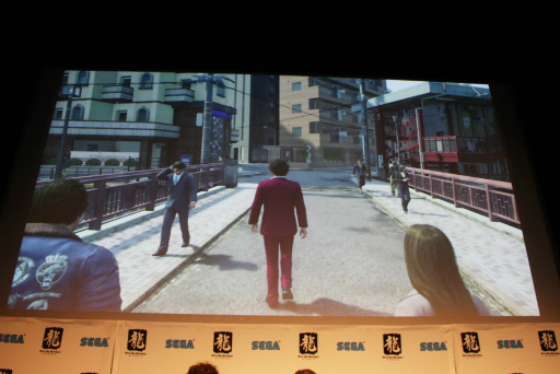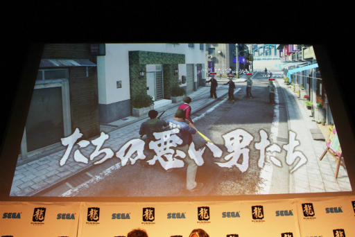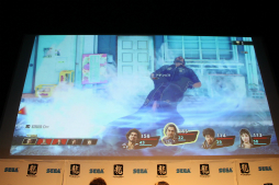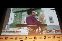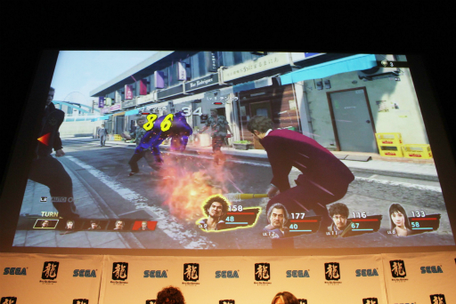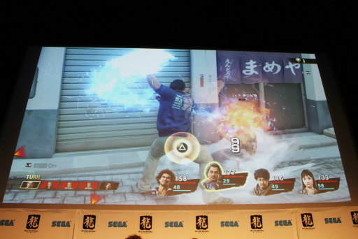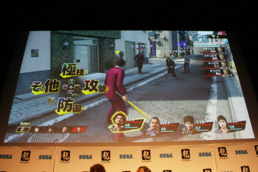 また,会場では本作のバトルシステムを紹介する映像と共に,詳しい解説がなされた。映像では,本作の主な舞台となる横浜・伊勢佐木異人町の街中を仲間とともに歩く春日の様子が映し出され,敵と遭遇するとこれまでのシリーズ同様にバトルが発生。それと共に画面上にコマンド入力の画面が表示され,コマンドと標的を選ぶとキャラクターが戦闘を行う様子が見られた。