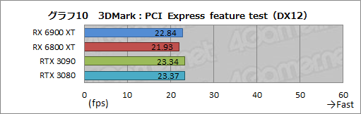 グラフ10は,PCI Express feature testの結果だ,今回のテストでは,すべてのGPUがPCIe 4.0に対応しているため,おおむね23GB/s前後で揃う結果となった。