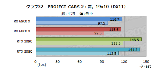 PROJECT CARS 2では,これまでと若干異なる傾向が見られた。まず平均フレームレートにおいて,RX 6900 XTは,2560×1440ドットまでの解像度ではRTX 3080に届いていないが,3840×2160ドットではRTX 3090にあと約2%のところまで差を詰めている。そして,最小フレームレートを見ると,RX 6900 XTは1920×1080ドットこそRTX 3080に差を付けられているものの,2560×1440ドットで逆転を果たし,3840×2160ドットでRTX 3090に約9%もの差を付けた。4K解像度に絞れば,最小フレームレートが高いRX 6900 XTのほうが快適さは良好なのではないだろうか。