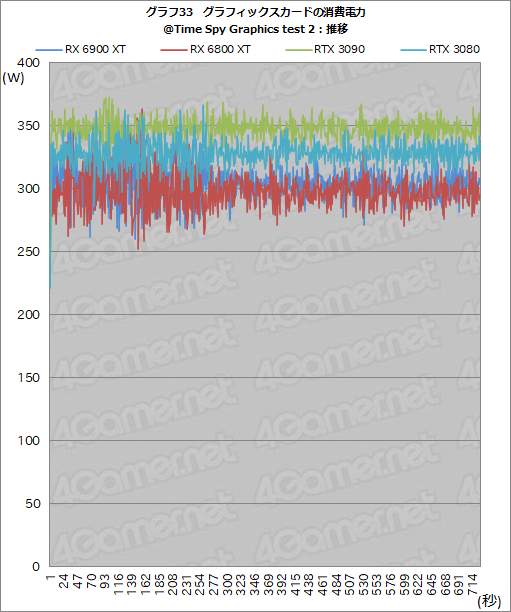 RX 6900 XTは,ほぼ300W前後で推移しており,たしかにRX 6800 XTとの差はほとんどないように見える。一方のRTX 3090は,350Wあたりを推移しているので,RX 6900 XTとの差は一目瞭然だ。