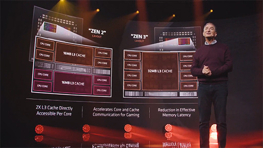 Zen 2(左)とZen 3(右)におけるCCXの違いを説明するAMDのCTOであるMark Papermaster氏。Zen 2は4基のCPUからなるCCX 2基で1個のCCDを構成していたが,Zen 3はCCX 1基で8基のCPUコアを統合している