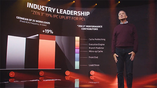 そのほかにも,Zen 3では整数演算および浮動小数点演算ユニットの拡張,分岐予測の改良,ロード/ストアユニットの改良などにより,前世代と比べてIPC( Instructions Per Clock,クロックあたりの命令実行数)を19%向上したのもポイントだ。