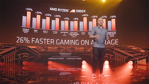 ゲームの実行性能を,Ryzen 9 5900XとZen 2世代のRyzen 9 3900XTで比較すると,「Battlefield V」では5%程度の差であるが,「League of Legends」になると50%も向上しているそうだ。