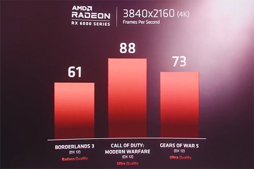 「Big Navi」とSu氏が呼ぶRadeon RX 6000は,4K解像度の「Borderlands 3」を60fps以上で表示できるほか,4K解像度の「Call of Duty: Modern Warfare」は88fps,「Gears 5」は73fpsで表示する性能を有するという。