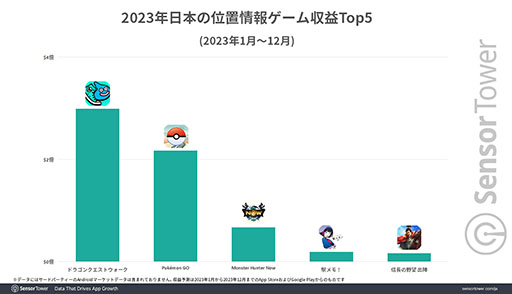 Sensor Towerのストアインテリジェンスのデータによると,2023年1月〜12月の日本における位置情報ゲームの収益トップは「ドラゴンクエストウォーク」で,その収益は約3億ドルを記録したそうだ。これは,日本の位置情報ゲームのおよそ半分に相当するという。2位は「Pokémon GO」,3位は「Monster Hunter Now」で,いずれもNianticがサービスしている位置情報ゲームとなった。