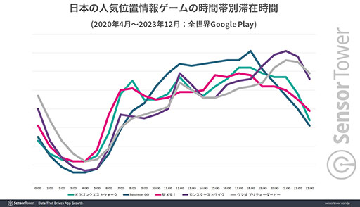 日本の位置情報ゲーム収益トップ5のプレイヤー平均年齢は35歳で,時間帯別滞在期間は8:00台や12:00台に増加しており,さらに17:00〜18:00台がピークに達しているとのこと。モバイルゲームの時間帯別滞在期間は一般的に21:00台に増える傾向があるそうだが,位置情報ゲームでは独自の様相を見せており,このことから通勤・退勤時やお昼休みにプレイされている可能性が高いという。