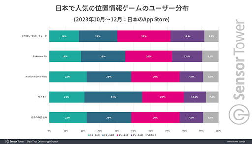 また,日本で人気の位置情報ゲームのプレイヤー分布では,女性プレイヤーの比率が高めであるという。Sensor Towerのデータによると,2023年第4四半期の日本のApp Storeにおけるプレイヤー分布では,ほとんどの位置情報ゲームが概ね男性6:女性4の比率となっており,2023年8月にリリースされた「信長の野望 出陣」では,プレイヤー比率が男性5:女性5の比率に達するそうだ。