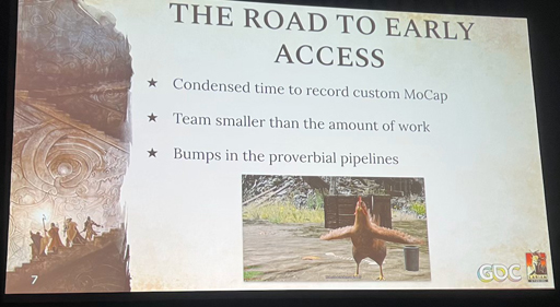 チームが作られたのは,氏が本作に参加した2019年10月のこと。アーリーアクセスの開始までおよそ1年という時期で,当初は社外のチームだった。いくつかのリサーチの結果,ゼロからでもシネマチック・アニメーション制作パイプラインの構築が必要と考えて動き出したが,人数が少ないところにCOVID-19(新型コロナウイルス感染症)感染拡大の影響によるモーションキャプチャ作業の制限,何千ものボイス付きモーションキャプチャのセリフのクリーンアップなど,問題は少なくなかった。