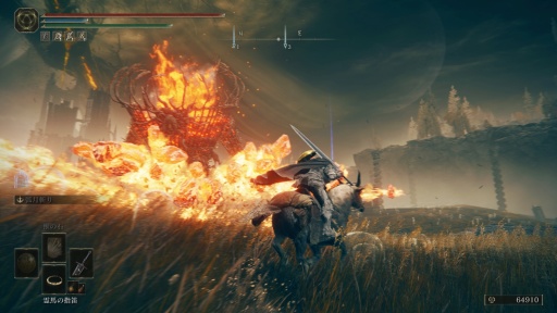 しかし,本DLCにはELDEN RING本編や通常のアクションゲームではあまり見ない,特異な性質が存在する。それはDLCエリア全体が,ゲームクリア近くまで育成を完了したキャラクターを“最初から使う前提”で設計されたオープンワールド世界であるということだ。