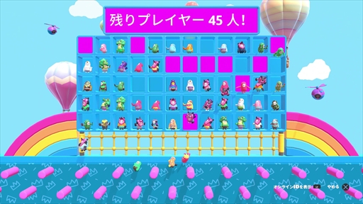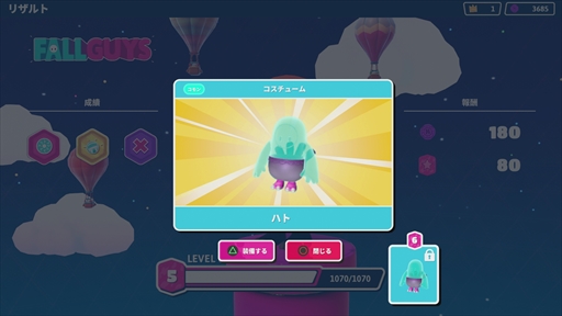 クラウンが手に入り,それぞれの数によりフォールガイの姿を変えるスキンや,ほかのプレイヤーにアピールするエモートを入手できるようになっている。
