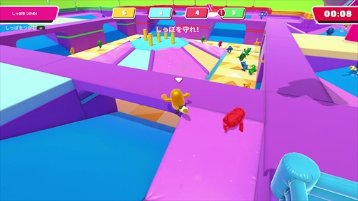 チーム戦はフォールガイの色がチームカラーになる。これは「チームしっぽオニ」。尻尾を取り合う鬼ごっこの団体戦だ