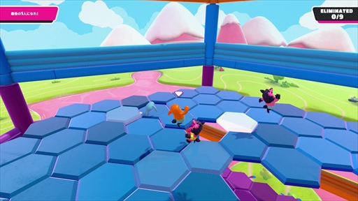 よたよたと歩いてボヨンとジャンプする操作はもどかしくも楽しく,うまく立ち回って上位で勝利できると実に気持ちがいい。逆にどんなにうまい人でも思わぬミスをして脱落する可能性もゼロではなく,ミスを誘発するように相手を邪魔してみるのもいいかもしれない。