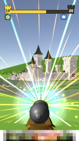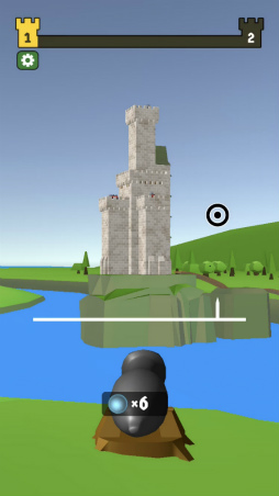 ゲームのルールは「大砲の残弾数以内に城の破壊ゲージを満タンにする」というもの。大砲の照準は左右→上下の順に自動で動くので,タイミングよく画面をタップし,狙いを定めよう。