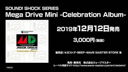 株式会社セガゲームスより好評販売中の『メガドライブミニ』を記念した CD『Mega Drive Mini-Celebration Album-』が、いよいよ 2019年12月12日(木)にリリースとなります! これに伴い、本日 2019年12月5日(木)より【セガ公式 YouTube チャンネル「セガ ムービーチャンネル」】にて、本 CD の試聴用 PVを公開致します。