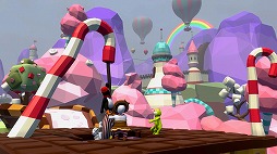 「キャンディキャッスル」など,お菓子に囲まれた世界だ。プレイヤーは,シーソー型のクッキープラットフォームでのバランス取り,キャンディケインでのジップライン,