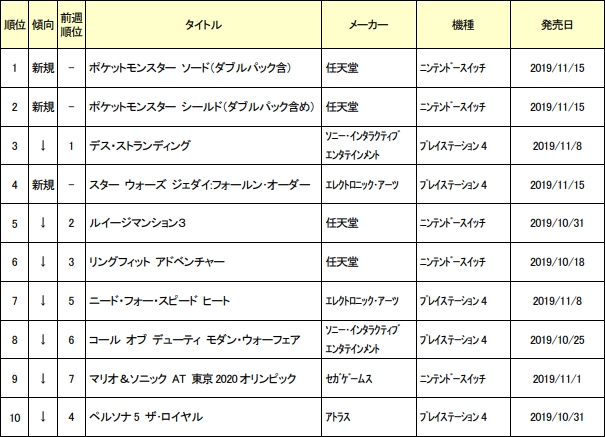 ゲオ,2019年11月2週めの新品ゲームソフト週間売上ランキングを公開