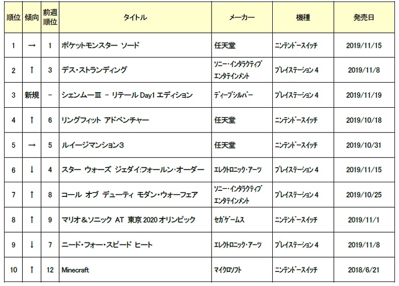2019年11月第3週の「ゲオ新品ゲームソフト週間売上ランキング」が公開に