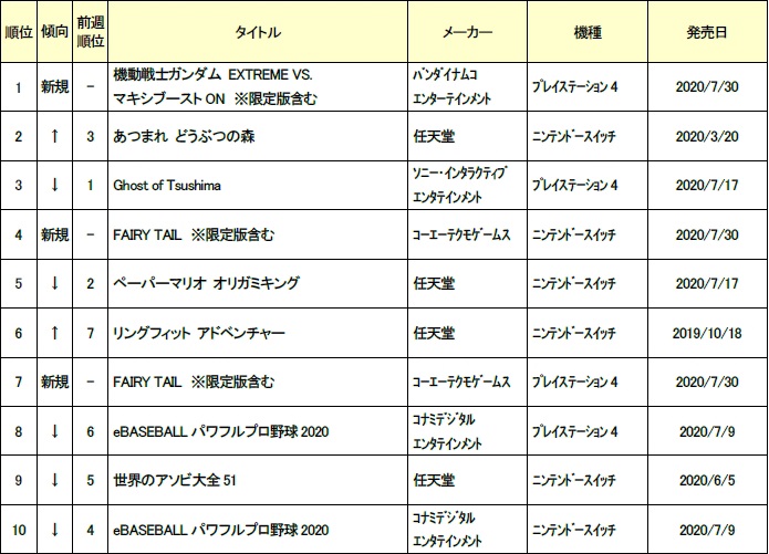 ゲオ,2020年7月4週目の新品ゲームソフト週間売上ランキングTOP10を公開