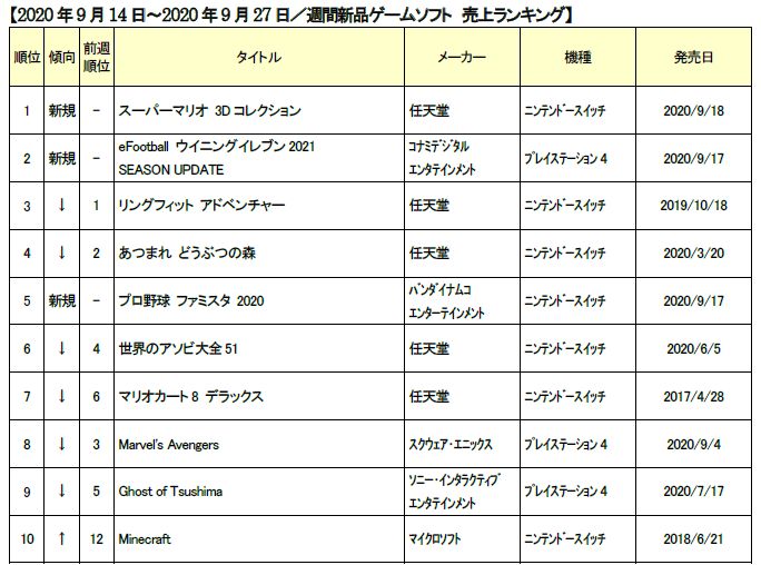 ゲオ,2020年9月2週目と3週目の新品ゲームソフト週間売上ランキングTOP10を発表