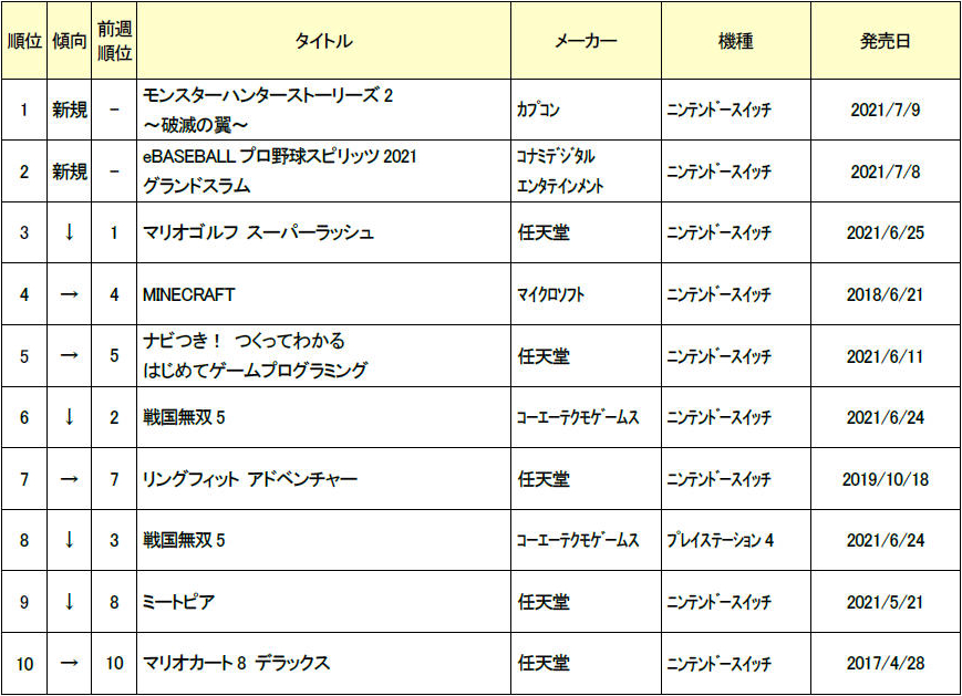 ゲオ,2021年7月1週目の新品ゲームソフト週間売上ランキングTOP10を発表