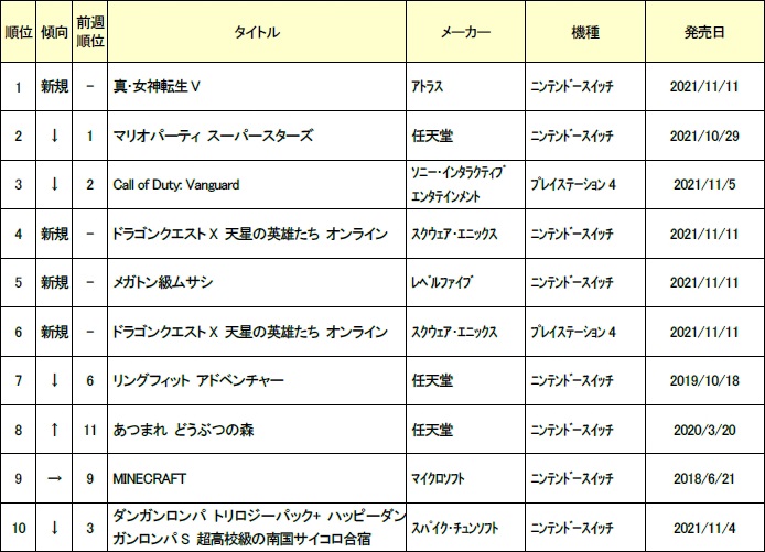ゲオ,2021年11月8日〜14日の新品ゲームソフト週間売上ランキングTOP10を公開