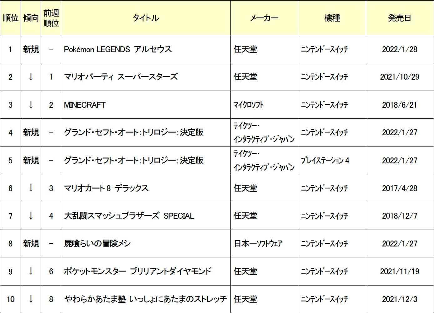 ゲオ,2022年1月24日〜30日の新品ゲームソフト週間売上ランキングTOP10を公開