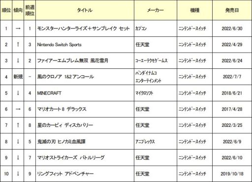 先週に引き続き、Switch「モンスターハンターライズ+サンブレイク セット」が2週連続で1位を獲得しました。夏休み以降も定番タイトルとして牽引できると予想しています。