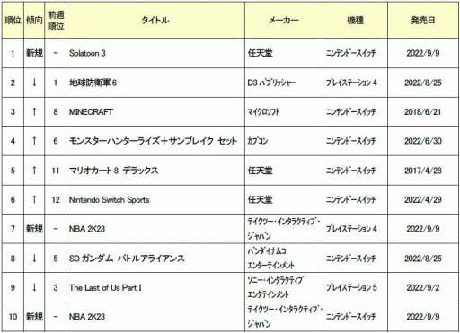 「スプラトゥーン」シリーズの完全新作が5 年ぶりに登場しました。今後の定番タイトルとして継続的な販売数に期待できるタイトルです。その他の新規タイトルでは、PS4・Switch 版「NBA2K23」が、それぞれ 7 位と 10 位にランクインしました。
