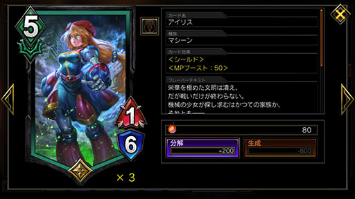 このデッキは赤緑の2色デッキなので,MP上限が5となっている。油断するとすぐMPがあふれてしまうので,積極的にユニットを出して攻勢をかけていこう。アクションは相手の動きを待つよりも,こちらから積極的に攻撃力アップのカードを使って仕掛けていくといいだろう。手札のカードをガンガン使っていくのは「逆鱗」の効果を上げる意味でもオススメの行動だ。