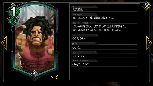 「連撃」持ちのユニットが攻撃に成功した直後には「猪突猛進」を積極的に使っていきたい。ユニットの破壊や停止といった対処をされなければ,即座にもう一度攻撃が入るので,勝負を決める一手となる。このデッキにおけるメインの勝ちパターンなので,しっかり意識した立ち回りをしていこう。