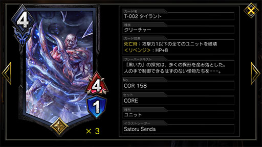 また,「ウロボロス」タイプのウェスカーにも有利がつくが,「黒き選別」タイプのリベンジウェスカーに対しては,ヒーローアーツでユニットが除去されやすいことも手伝って,やや不利。このマッチでとくに注意したいのが「T-002 タイラント」。このユニットの破壊時効果で,「アイリス」「アイルー」といった攻撃力1のユニットが除去されてしまう。攻撃する直前に出されると瞬時に対応するのは難しいので,事前に「アイリス」「アイルー」の攻撃力を上げて対策しよう。