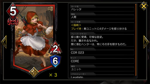 例えば,相手が3MP2/4のユニットを場に出していたとしよう。返しにプレイ時に4ダメージを振り分ける5MP2/6臨戦の「バレッタ」を出した場合,相手の2/4のユニットを一方的に除去でき,こちらの盤面には2/6臨戦のユニットが残る。このとき,相手の使用したMPの差は2なので,実質2MPで2/6臨戦のユニットを出していることになり,非常にコストパフォーマンスの高いプレイとなるのだ。こうしたプレイを積み重ねながら盤面を制していくのが赤単テンポリュウの戦い方となっている。
