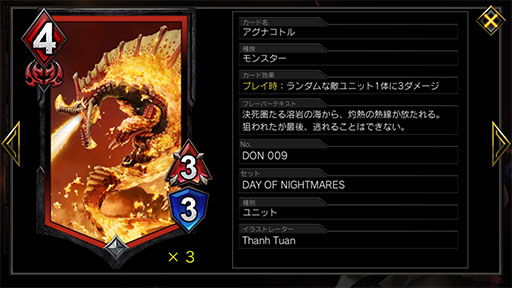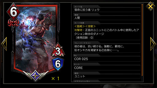 このデッキの唯一無二の強烈なフィニッシャーが「宿命に抗う者 リュウ」。「臨戦」「俊敏」に加え,攻撃時にアクションを使用した回数分ダメージを与えるという強力無比な効果を持つ。しかも,この攻撃時ダメージは通常攻撃の前に判定があるのが強み。この効果によるダメージ以下のHPを持つユニットであれば,リュウは反撃ダメージを受けずに,一方的に相手を除去できるのだ。