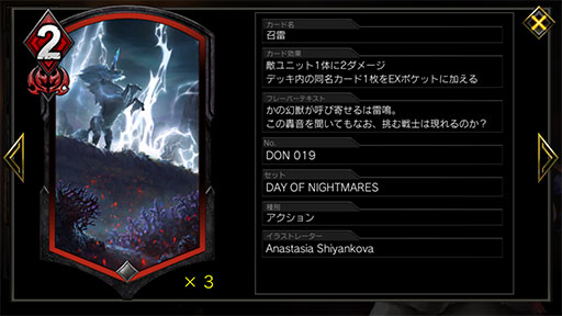 リュウの真価を発揮させるため,アクションカードを細かく使っていくのがこのデッキにおけるポイントの1つ。そこで役に立つのが,DONで追加された新しいアクションカード「召雷」だ。2MPとコストが軽く,かつ使用すると「召雷」をEXポケットに引いてくる効果を持つので,アクションカードの使用回数を積み重ねたいときに最適。使用時の効果も敵ユニットに2ダメージを与えるというもので,腐らないことが多い。