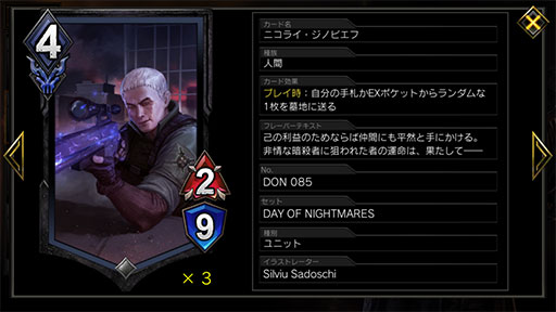 序盤では,スタッツ高めのユニット「VAVA」,DONで新たに加わったカード「ニコライ・ジノビエフ」といった,デメリットと引き替えに強力なスタッツを持ったユニットたちが活躍する。リベンジ持ちのユニットだけで戦うと盤面を押されてしまいがちなので,これらを併用する形で臨むと良い。