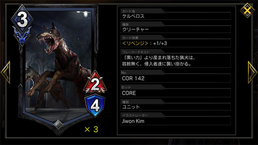 中盤以降は,リベンジ発動済みのユニットで押し込んでいける。例えば「ケルベロス」であれば,リベンジ発動後は1MP3/7という破格のコストパフォーマンスになる。「ケルベロス」に限らず,ほとんどのリベンジ発動済みユニットは1MPないし2MPのユニットとなって手札にやってくるため,一気に盤面を逆転することも可能だ。このリベンジユニット祭りのターンになるまで,どれだけ被害を最小限に抑えられるかが,選別リベンジウェスカーで勝つためのテーマとなる。