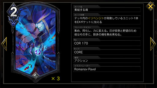 また,リベンジが発動したユニットを引くための手段として「集結する魂」も忘れてはいけない。使用コストが2MPで,アクティブレスポンス時の追加MPを使えば,無料で使用できる。どうしようもないときは自分から使用するのもありだが,序盤はMPに余裕がないので,極力アクティブレスポンス時の追加MPで使用することを心がけよう。