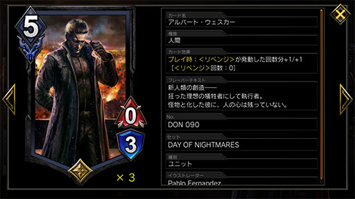 DON版の選別リベンジウェスカーが前シーズンと異なる点は,新カード「アルバート・ウェスカー」の存在だ。「アルバート・ウェスカー」は,素の能力は5MP0/3というものだが,プレイ時に「リベンジが発動した回数分+1/+1する」という能力を持っているので,実際には7/10と9/12といった巨大サイズで出てくる。このデッキの最大のリベンジ発動回数は15なので,攻撃力10以上のサイズになって出てくることも決して珍しくないのだ。
