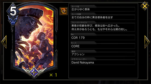 「アルバート・ウェスカー」のリベンジ回数を稼ぐうえで有効なカードは,5MPで3MP2/3リベンジのゾンビを3体場に出せるレジェンダリー「広がりゆく感染」だ。このカードは,5MPで9MP相当の行動ができるうえリベンジを3回分稼げるため,リベンジ発動済みのゾンビを早くデッキに送ることができ,「アルバート・ウェスカー」のパワーアップにもつながる。手札にあるときは,できるだけ早い段階で使いたいカードだ。