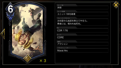 すべての敵ユニットが「黒き選別」の対象になるのが大きく,「T-002 タイラント」の死亡時効果も突き刺さる。とはいえ,除去の隙間をぬって「逆鱗」からの「猪突猛進」を決められると負けてしまうので,相手の「猪突猛進」に対応するための「抹殺」を1枚手札に残しておくと安全だ。「殺戮の棘」は後出しバフでカウンターされるので,使いどころには注意。